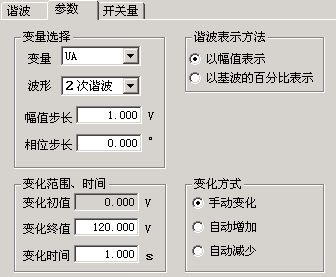 幅值步長:這里的步長也與“諧波表示方法”相對應(yīng)。當選擇“以幅值表示”時,步長也以幅值表示,單位是A或V;而選擇“以基波的百分比表示”時,則步長也是百分比。