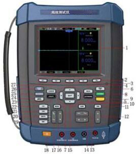 手持式局放測試儀主機的前面板分為若干功能區(qū),根據(jù)上圖標注標號分別為:
