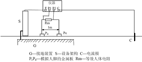 式中Is 為被測接地裝置內系統(tǒng)單相接地故障電流。上述測量中,若儀器電壓輸入端不并聯(lián)等效人體電阻Rm,則所得結果為跨步電位差。
