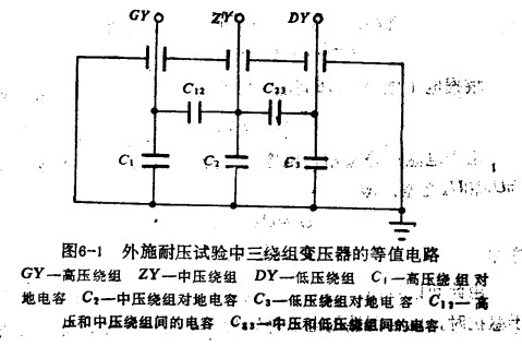 變壓器一般由兩個以上的繞組組成,每個繞組對地都有絕緣,相鄰的兩個繞組也有絕緣,這樣就可以將每個繞組看成是電容器的一個極板,接地部分看成電容器的另一個極板。一臺三繞組變壓器的等值電路,如圖6-1所示。