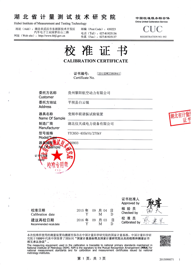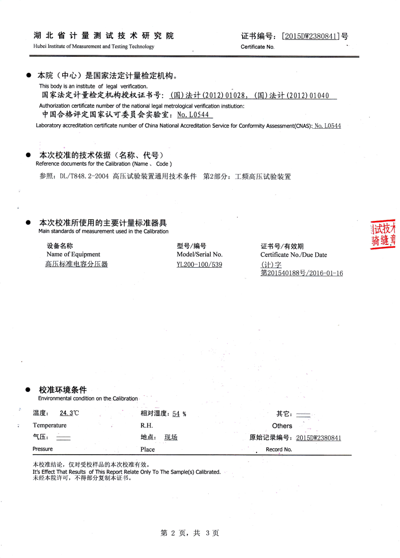 | YTC850-810/270 | 30kW | 30kVA | 45kV/2A/9臺(tái) | 300kV | 110kV套管、GIS、支柱絕緣子、隔離開關(guān) |