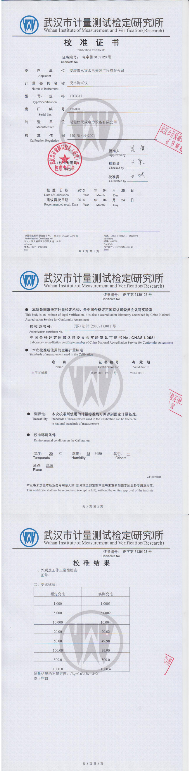 YTC3317全自動(dòng)變比組別測試儀資質(zhì)證書