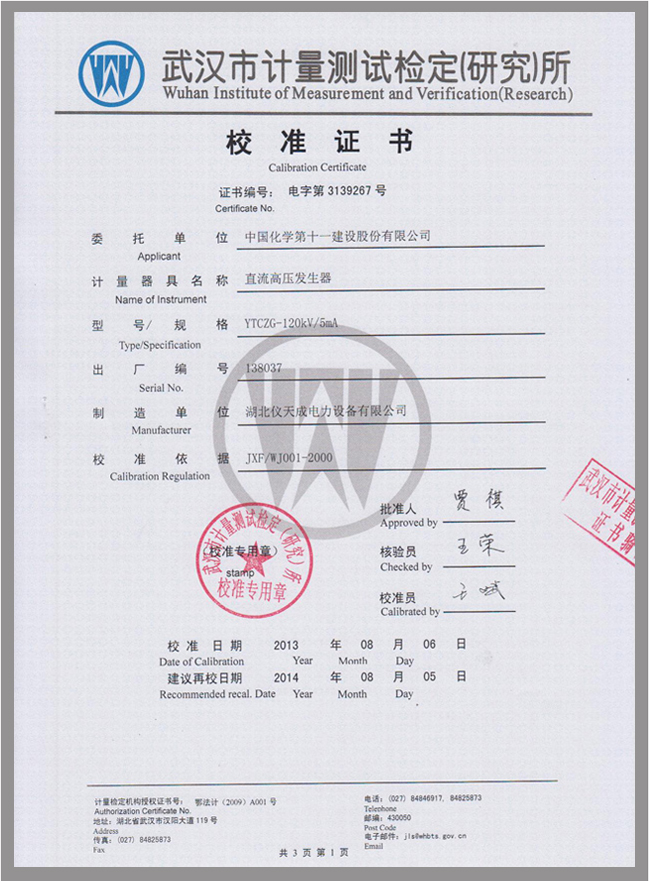 上一篇:YTCDG系列大電流發(fā)生器鑒定證書 下一篇:YTCZG-60kV/2mA直流高壓發(fā)生器鑒定證書