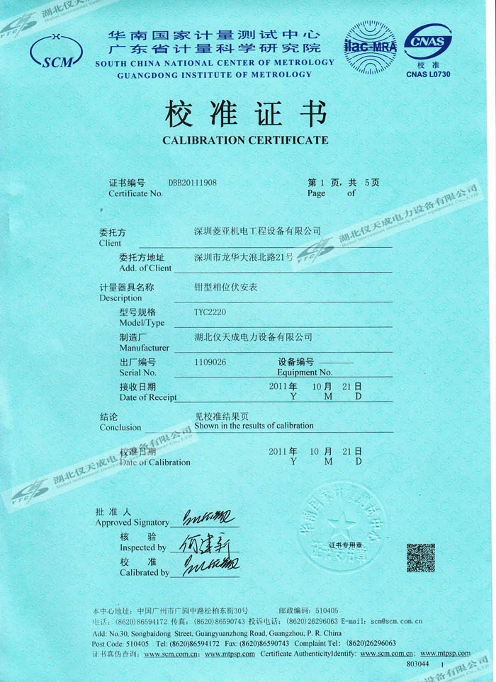 轉(zhuǎn)載:"YTC2220鉗型相位伏安表的資質(zhì)證書" 請注明來源于儀天成電力。 更多技術(shù)問題請致電儀天成電力客戶服務(wù):027-87876585,技術(shù)部專線:027-87876585,在線客服:719388481