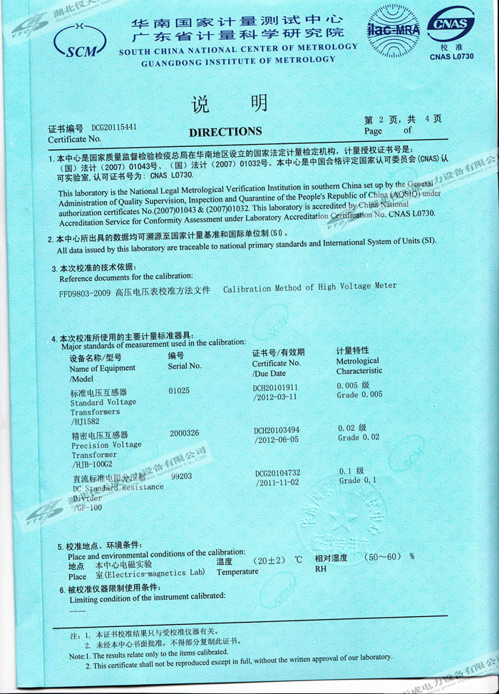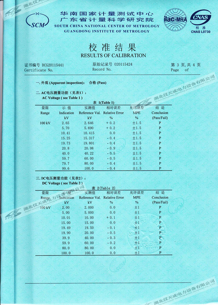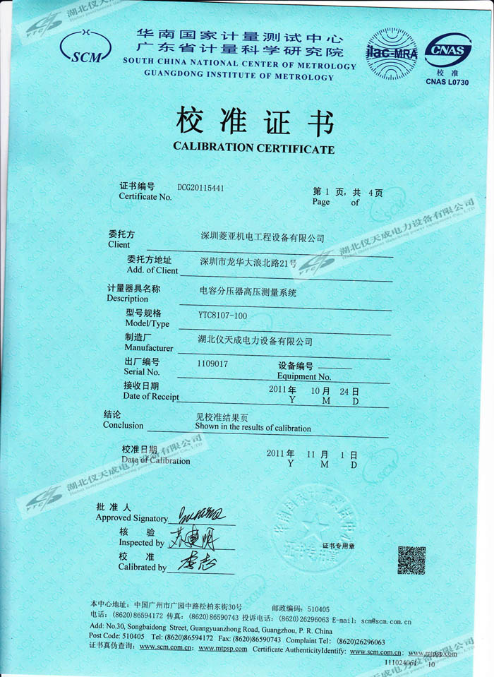 YTC8107-100電容分壓器高壓測(cè)量系統(tǒng)的資質(zhì)證書
