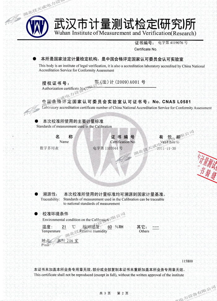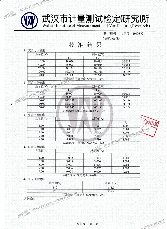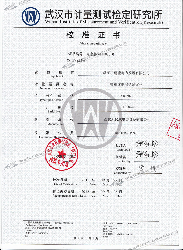 YTC702微機繼電保護測試儀的資質(zhì)證書