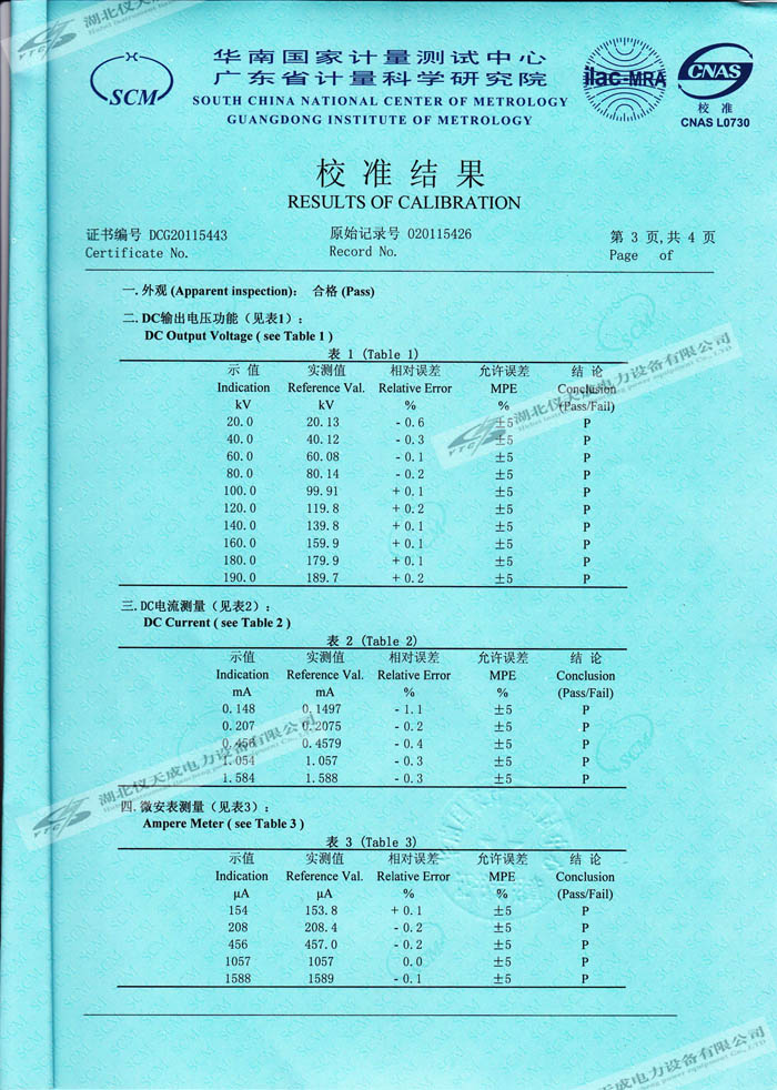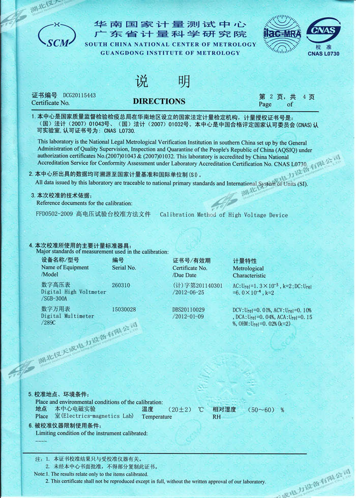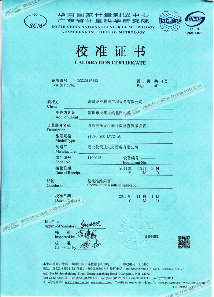 轉載:"YTCZG-200kV2mA直流高壓發(fā)生器的資質證書" 請注明來源于儀天成電力。 更多技術問題請致電儀天成電力客戶服務:027-87876585,技術部專線:027-87876585,在線客服:719388481