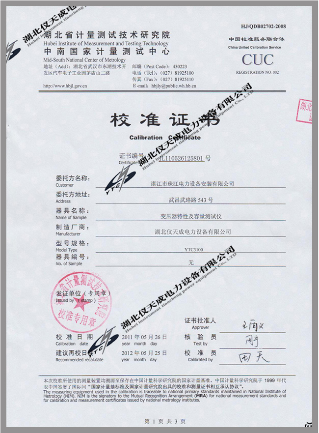 轉(zhuǎn)載:"YTC3100變壓器容量及損耗參數(shù)測(cè)試儀鑒定證書(shū)" 請(qǐng)注明來(lái)源于儀天成電力。 更多技術(shù)問(wèn)題請(qǐng)致電儀天成電力客戶服務(wù):027-87876585,技術(shù)部專(zhuān)線:027-87876585,在線客服: