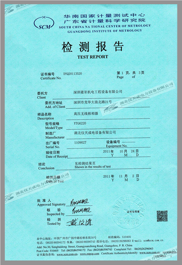 轉(zhuǎn)載:"YTC6220高壓無線核相器鑒定證書" 請注明來源于儀天成電力。 更多技術(shù)問題請致電儀天成電力客戶服務(wù):027-87876585,技術(shù)部專線:027-87876585,在線客服: