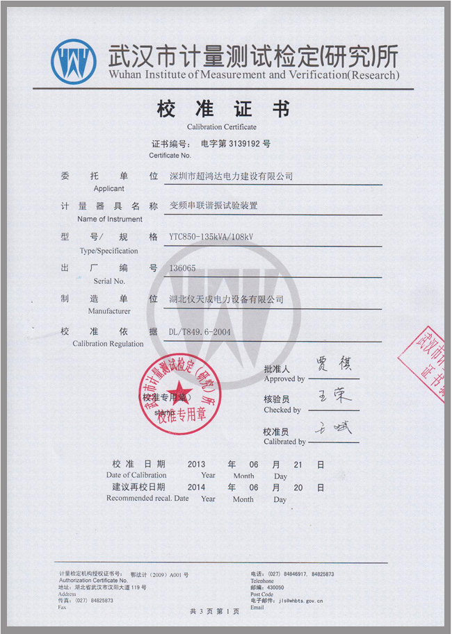 轉(zhuǎn)載:"YTC850系列電纜交流耐壓試驗裝置鑒定證書" 請注明來源于儀天成電力。 更多技術(shù)問題請致電儀天成電力客戶服務(wù):027-87876585,技術(shù)部專線:027-87876585,在線客服: